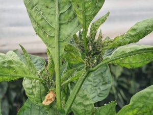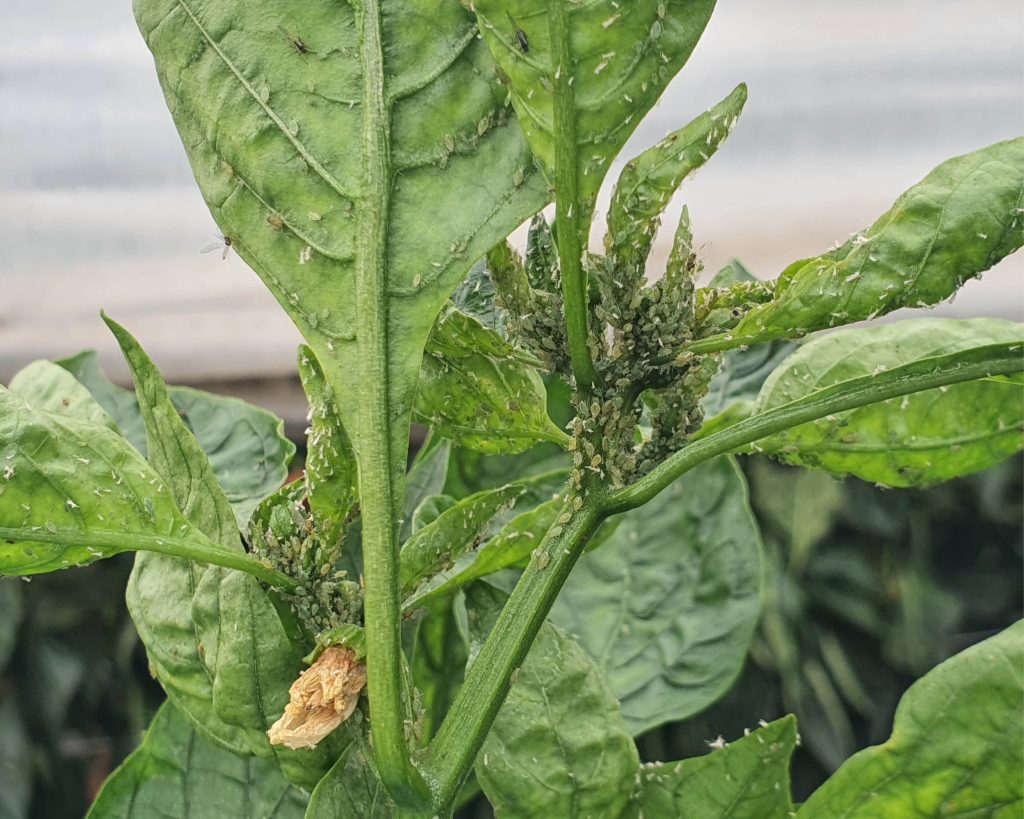 Gli afidi su peperoni coltivati in serra possono essere particolarmente difficili da contenere, perché le condizioni ideali di temperatura e umidità nei tunnel possono favorire la rapida proliferazione di questi insetti.